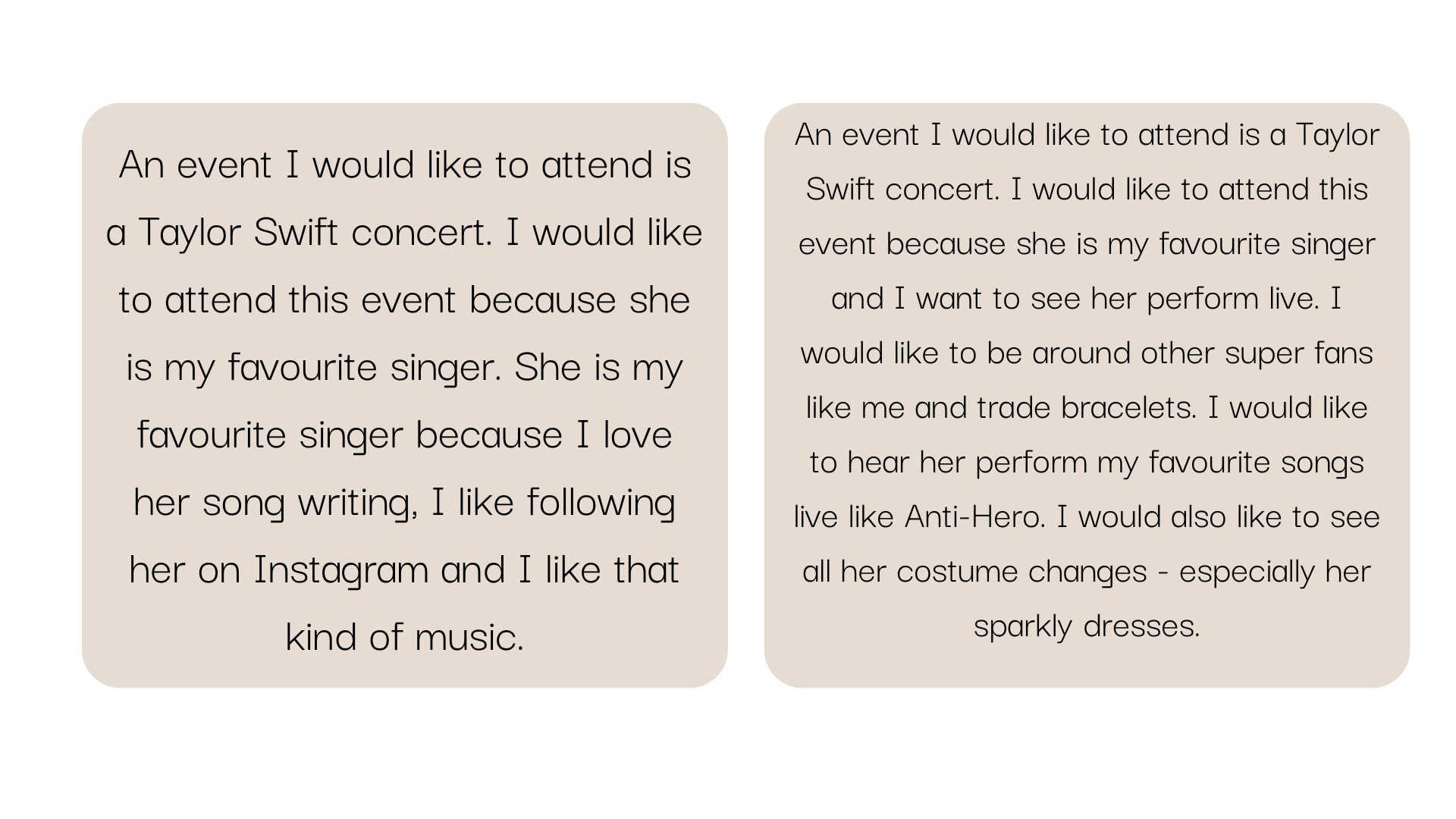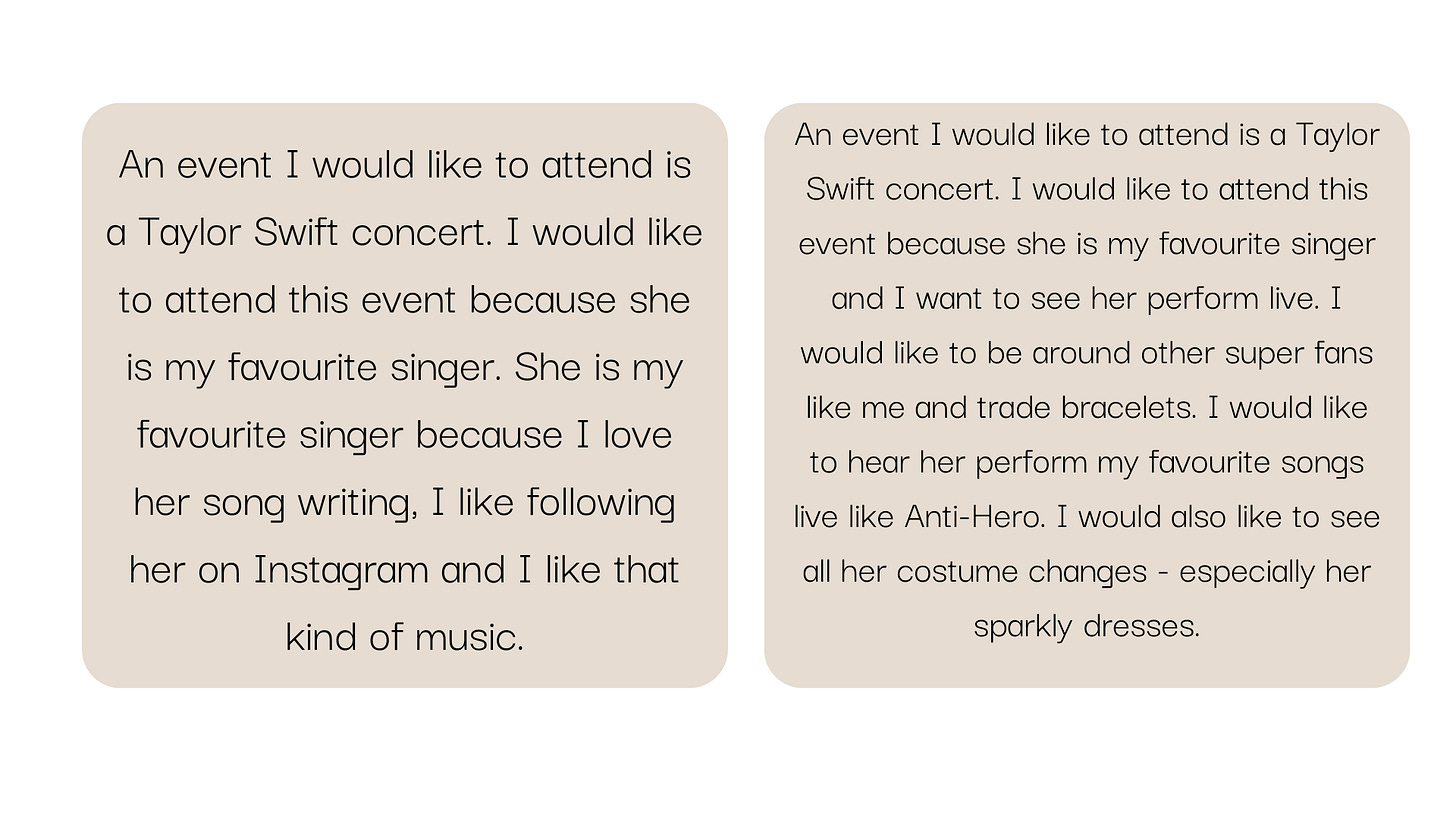 (Students will inevitably provide ideas that are not part of the criteria we are looking for. They might say something like, ‘It has good grammar’ or ‘the second one is longer’. While these are true points, it is not what we are looking for to develop ‘explain’ so we can acknowledge those ideas and then park them to the side.)